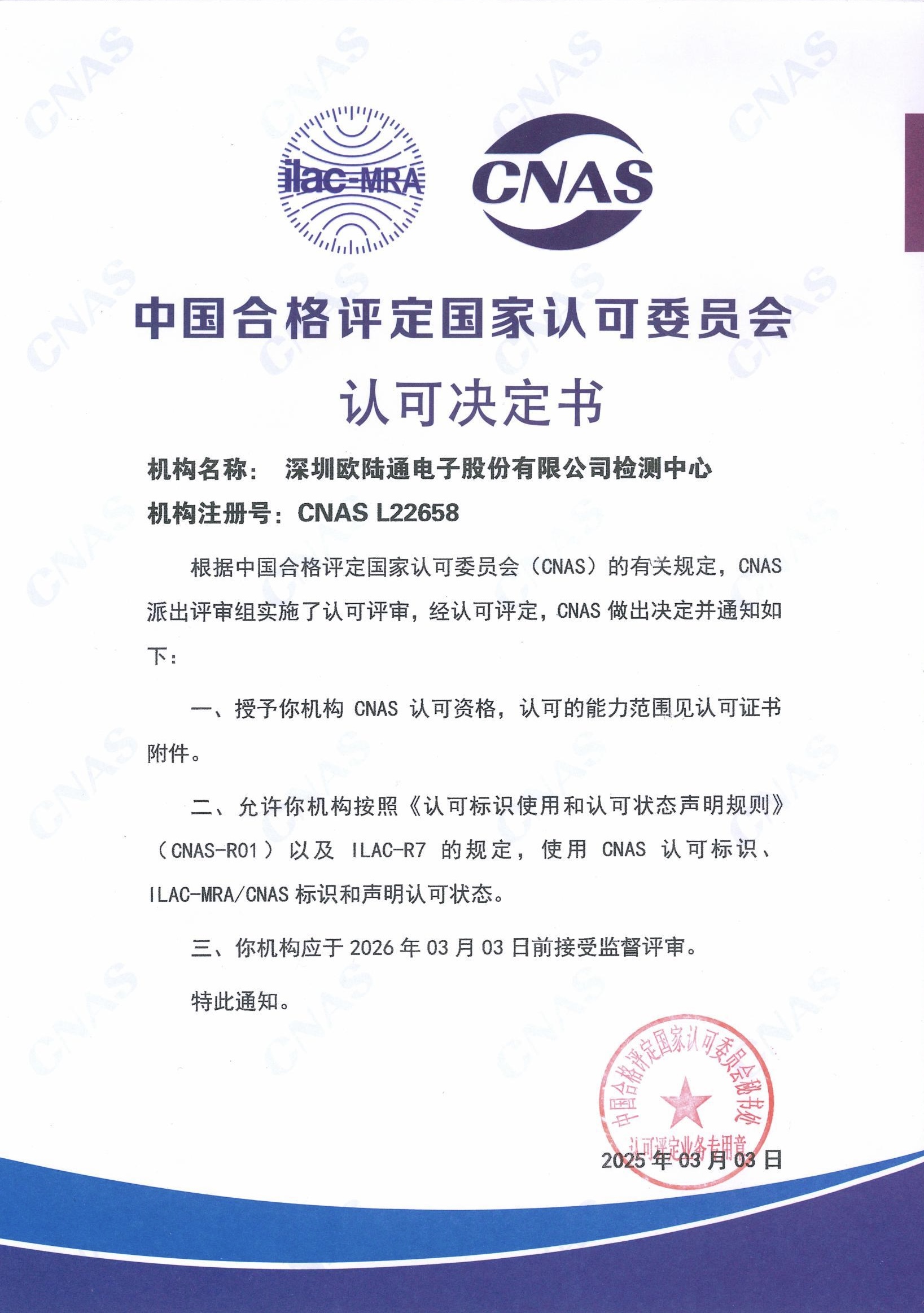 近日,歐陸通實(shí)驗(yàn)室順利通過了中國合格評(píng)定國家認(rèn)可委員會(huì)(CNAS)資質(zhì)評(píng)審及合格評(píng)定,榮獲國家級(jí)CNAS實(shí)驗(yàn)室認(rèn)可證書,標(biāo)志著公司實(shí)驗(yàn)室的測試能力與管理體系已達(dá)到國際互認(rèn)水平,檢測報(bào)告和結(jié)果可實(shí)現(xiàn)在全球上百個(gè)國家和地區(qū)的互信認(rèn)可。